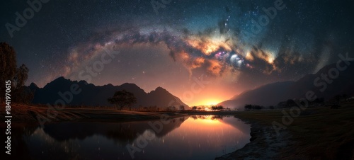 © MindPix, Obraz premium Breathtaking panoramic landscape of a serene lake reflecting a star-filled night sky, Milky Way arching above silhouetted mountains at sunset, dreamy and ethereal scenery