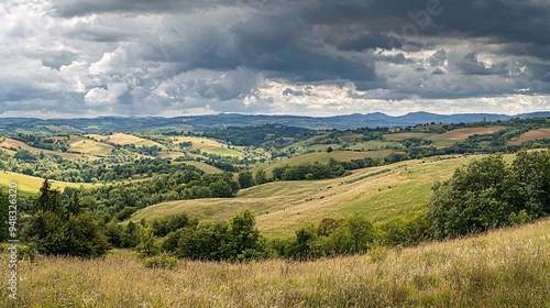 Naklejka premium Breathtaking Panoramic Landscape Showcasing Rolling Hills and Lush Green...