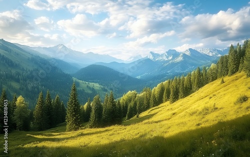 © Yassine DS, Fototapeta premium Breathtaking panoramic mountain landscape with vibrant green forests, blue skies, and rolling hills under soft sunlight
