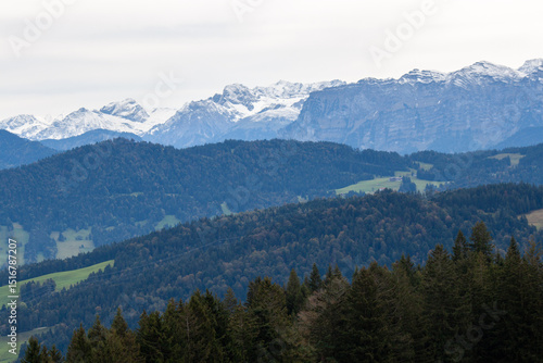 © virin, Fototapeta premium Breathtaking panoramic view from the Pfänder mountain in showcasing the majestic snow-capped Alps stretching across the horizon