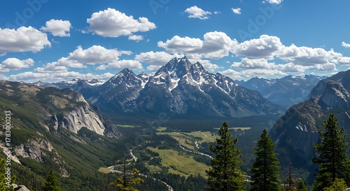 © Bagio, Obraz premium Breathtaking panoramic view of a majestic mountain range under a blue sky with fluffy white clouds.