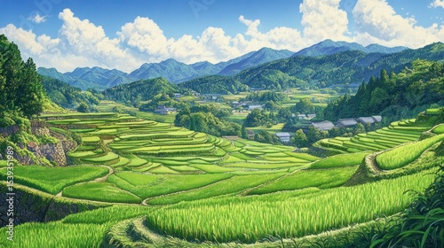 © Jeerawut, Fototapeta premium Breathtaking panoramic view of lush green terraced rice paddies in a rural mountain landscape highlighting vibrant vegetation and scenic natural beauty under clear blue sky