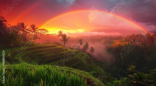 Obraz premium Breathtaking Rainbow Over Lush Green Rice Terraces In Bali Indonesia