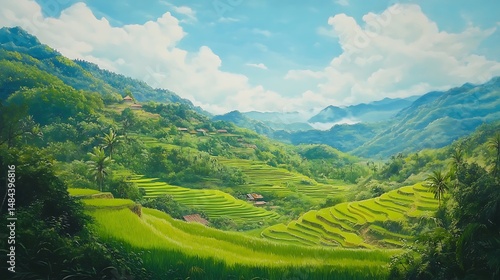 © aseenz imagine, Fototapeta premium Breathtaking rice terraces carve through lush green mountains with vibrant paddies and soft sunlight for peaceful rural beauty and harmonious natural landscape concept.