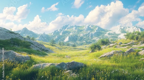 © ArtificialHorizons, Fototapeta premium Breathtaking rocky mountain range surrounded by vibrant grassy hills under a clear blue sky with fluffy white clouds.