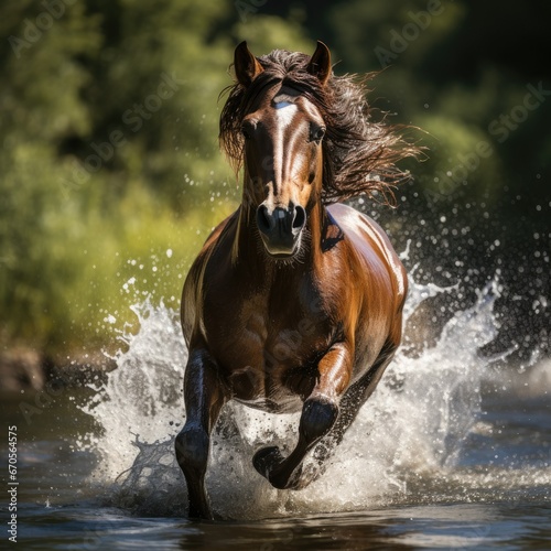 © Made360, Fototapeta premium Breathtaking Scene of Horses Crossing Pond in Harmonious Beauty and Grace