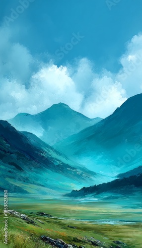Naklejka premium Breathtaking Scenic Mountain Range Landscape with Mist, Meadow, and Dramatic...