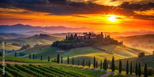 Naklejka premium Breathtaking Silhouette Photography of Tuscany Valley at Sunset – Rolling Hills, Vineyards, and Cypresses in Golden Light