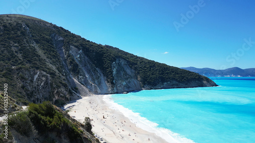 © Elina, Fototapeta premium Breathtaking Stunning Beach View Featuring Crystal Clear Water and Scenic, Lush Green Hills