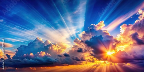 © Oliver, Fototapeta premium Breathtaking Sun Rays Piercing Vibrant Blue Sky and Colorful Cloudscape