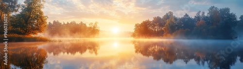 © nuttapong, Fototapeta premium Breathtaking sunrise over a serene lake, with mist rising and vibrant colors reflecting on calm water. Perfect for nature lovers.