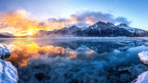 © Nakorn, Naklejka premium Breathtaking sunrise over lake eibsee nature photography winter landscape tranquil environment scenic viewpoint