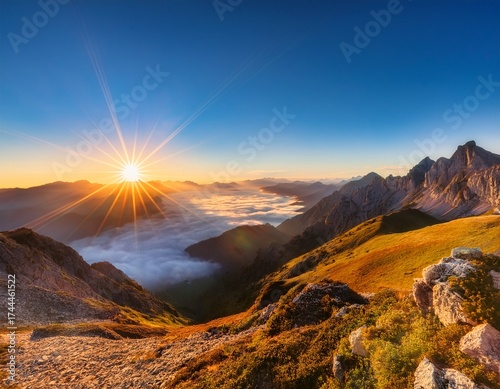 © Ellis, Obraz premium breathtaking sunrise over majestic mountain peaks with vibrant sun rays and soft fog in valley below