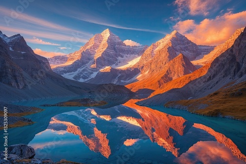 © Michael, Obraz premium Breathtaking Sunrise Over Majestic Mountains with Colorful Lakes and Sparkling Reflections