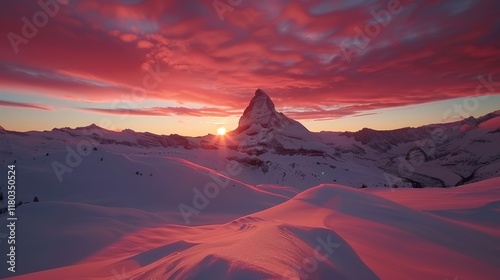 Naklejka premium Breathtaking sunrise over majestic snow capped mountain peak surrounded by...