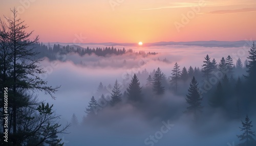 Fototapeta premium Breathtaking sunrise over misty forest landscape tranquil nature scene serene outdoor environment aerial viewpoint captivating concept