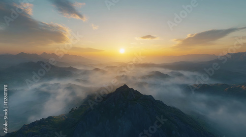 © Chonthicha, Obraz premium breathtaking sunrise over serene mountain landscapes with mist