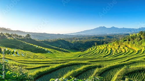 © Iswanto, Fototapeta premium Breathtaking Sunrise Over Terraced Rice Fields Surrounded by Majestic Mountains