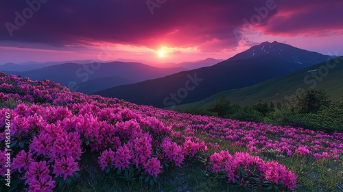 © jiacheng, Fototapeta premium Breathtaking sunrise over the Carpathian Mountains with vibrant pink and purple sky illuminating blooming rhododendrons on alpine hillside