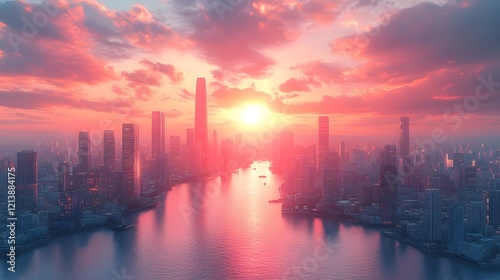 © Thawatchai, Fototapeta premium Breathtaking Sunset Over a Thriving Metropolis Skyline with Majestic Skyscrapers and Glowing Reflections on the River