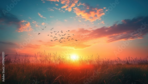 Fototapeta premium Breathtaking Sunset Over a Tranquil Field with Vibrant Colors and Silhouetted Birds Flying in the Sky, Creating a Peaceful and Serene Atmosphere at Dusk