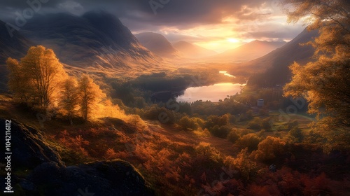 Fototapeta premium Breathtaking sunset over a tranquil valley with autumn foliage and shimmering...