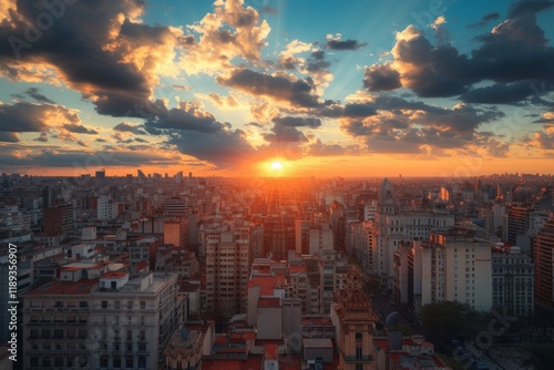 Obraz premium Breathtaking sunset over Buenos Aires, Argentina captivating the skyline with vibrant colors and dramatic clouds, signaling the end of the day in a bustling city