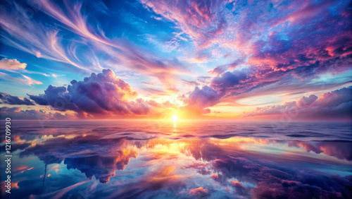 © chacoal9653, Obraz premium Breathtaking sunset over calm ocean waters, reflecting vibrant colors and clouds