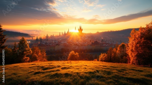 © Watcharaporn, Fototapeta premium Breathtaking sunset over historic cityscape with ancient architecture and lush autumn foliage