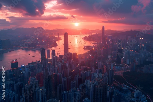 Fototapeta premium Breathtaking Sunset Over Hong Kong's Skyline and Harbor