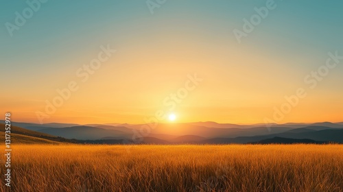 Fototapeta premium Breathtaking sunset over majestic mountains and a serene grass field, golden...
