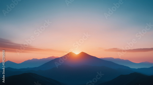 © NaphakStudio, Fototapeta premium breathtaking sunset over mountain peaks, casting warm hues across sky and valleys, creating serene and tranquil atmosphere.