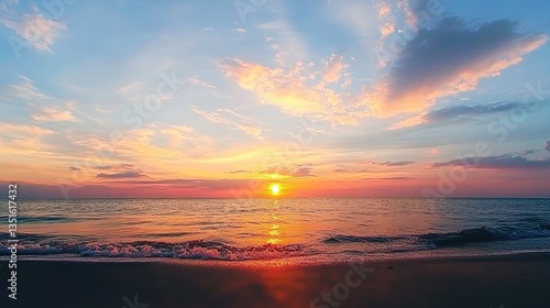 © tang, Naklejka premium Breathtaking Sunset Over Ocean with Vibrant Orange and Pink Sky, Intricate Cloud Patterns Resembling Rainbows, Captured with Ultra-Wide Lens and High-Resolution Camera