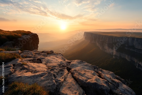 Fototapeta premium Breathtaking sunset over rocky cliffs with a panoramic view of the valley below