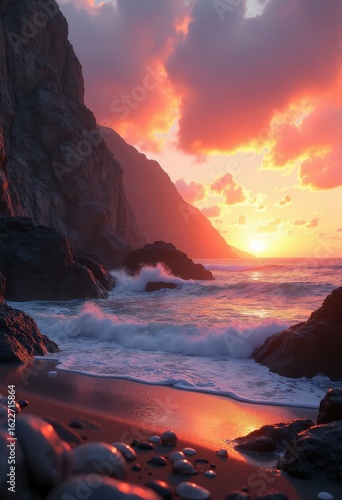 Fototapeta premium breathtaking sunset over rocky coastline cliffs dramatic sky waves ocean view...