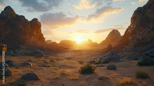 Naklejka premium Breathtaking sunset over rocky desert landscape with dramatic rock formations...