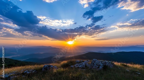© Generative AI, Obraz premium Breathtaking Sunset Over Rolling Hills with Dramatic Cloud Formation : Generative AI