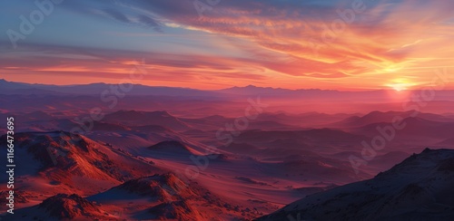 Naklejka premium Breathtaking sunset over rugged mountains, showcasing vibrant colors and...