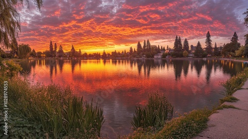 © pinporn manosri, Obraz premium Breathtaking Sunset Over Serene Lake Reflections