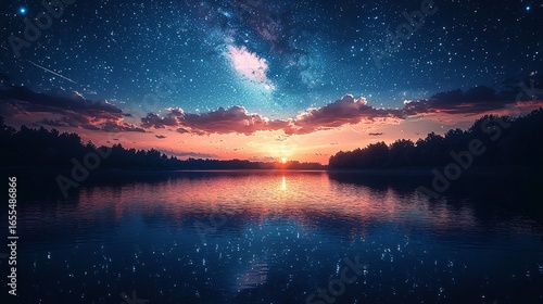 Fototapeta premium Breathtaking Sunset Over Serene Lake with Starry Night Sky