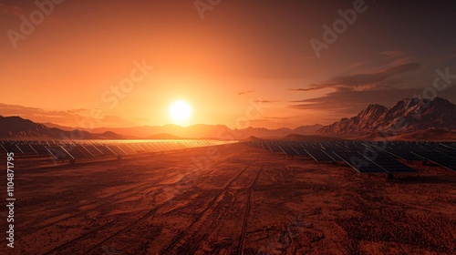 Obraz premium Breathtaking sunset over solar panels in a vast desert landscape,...