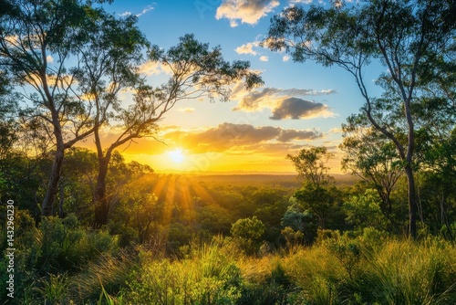 © Iftikhar alam, Fototapeta premium Breathtaking sunset over the wild nature of Australia's Northern Territory reflecting vibrant colors, Australia Northern Territory sunset in wild nature landscape Bush forest view