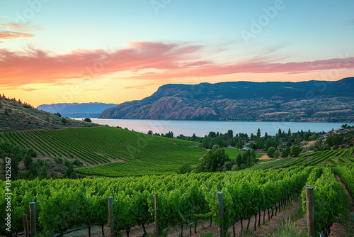 Naklejka premium Breathtaking sunset over verdant vineyard and tranquil lake, framed by...