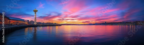 Fototapeta premium Breathtaking sunset panorama of Seattle skyline with vibrant colors reflecting on the water