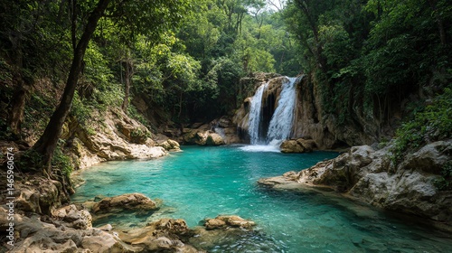 Fototapeta premium Breathtaking turquoise waterfall cascading into a crystal-clear pool, set in...