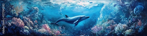 Fototapeta premium Breathtaking Underwater Panorama Featuring Playful Dolphins in Their Natural...