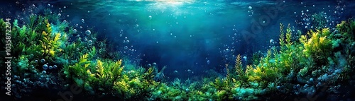 © Plumeria, Fototapeta premium Breathtaking Underwater Scene with Lush Greenery and Bubbles