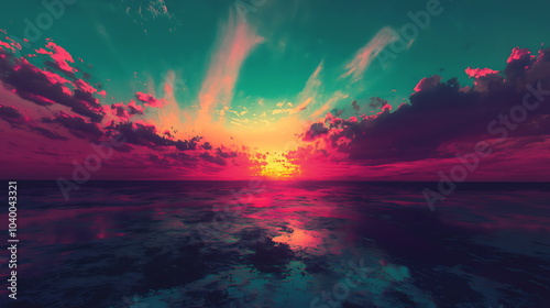 Fototapeta premium Breathtaking vibrant sunset over ocean with colorful clouds reflecting on the...
