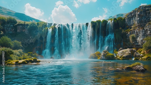Naklejka premium Breathtaking view of a serene waterfall cascading into a clear, blue river...