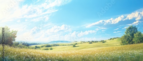 © SynthArt BWG, Obraz premium Breathtaking view of a sunny meadow with vibrant flowers under a clear blue sky.